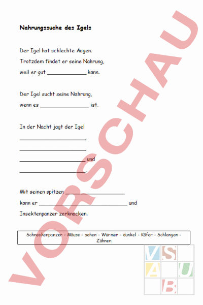 Nahrungssuche des Igels Der Igel hat schlechte Augen. Trotzdem findet er seine Nahrung, weil er gut kann. Der Igel sucht seine Nahrung, wenn es ist. In der Nacht jagt der Igel , , und . Mit seinen spitzen kann er und Insektenpanzer zerknacken. Schneckenpanzer Mäuse – sehen Würmer – dunkel Käfer Schlangen Zähnen
