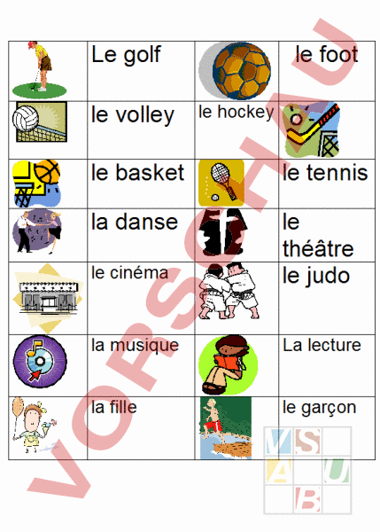 Le golf le volley le foot le hockey le basket le tennis la danse le cinéma le théâtre le judo la musique La lecture la fille le garçon