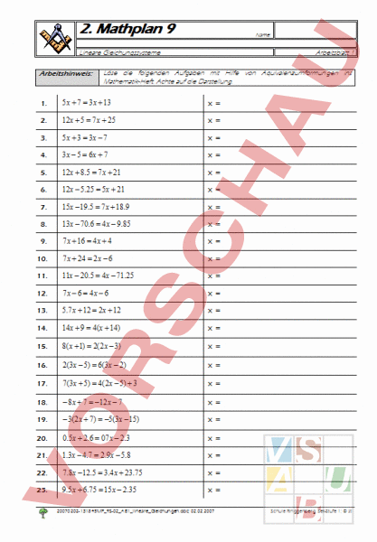 2. Mathplan 9 Name: Lineare Gleichungssysteme Arbeitshinweis: Arbeitsblatt 1 Löse die folgenden Aufgaben mit Hilfe von Äquivalenzumformungen ins Mathematik-Heft. Achte auf die Darstellung. 1. 5 7 3 13 x 2. 12 5 7 25 x 3. 5 3 3x 7 x 4. 3x 5 6 7 x 5. 12 8.5 7 21 x 6. 12 5.25 5 21 x 7. 15 19.5 7 18.9 x 8. 13 70.6 4 9.85 x 9. 7 16 4 4 x 10. 7 24 2 6 x 11. 11x 20.5 4 71.25 x 12. 7 6 4x 6 x 13. 5.7 12 2 12 x 14. 14 9 4( 14) x 15. 8( 1) 2(2 3) x 16. 2(3x 5) 6(3x 2) x 17. 7(3 5) 4(2 5) 3 x 18. 8 7 12 7 x 19. 3(2 7) 5(3x 15) x 20. 0.5 2.6 07 2.3 x 21. 1 .3 4 7 2 .9 5 8 x 22. 7.8 12.5 3.4 23.75 x 23. 9.5 6.75 15 2.35 x 20070202-131845MP_9S-02_AB1_lineare_Gleichungen.doc; 02.02.2007 Schule Ringgenberg, Sek-Stufe 1; st 2. Mathplan 9 Name: Lineare Gleichungssysteme Arbeitshinweis: Arbeitsblatt 1 Löse die folgenden Ungleichungen genau gleich wie Gleichungen mit Hilfe von Äquivalenzumformungen ins Mathematik-Heft. Achte auf die Darstellung. 24. 5 2 3x 4 x 25. 3(2 4) 2(4 5) x 26. 3(2 7) 8 20 x 27. 2 11 5 x 28. 1 0.3 2 x 29. 38 31 25 36 x 30. 0.5 17.5 39 x 31. 5 312 167 x 32. 3 198 69 x 33. 10 30 700 x 20070202-131845MP_9S-02_AB1_lineare_Gleichungen.doc; 02.02.2007 Schule Ringgenberg, Sek-Stufe 1; st
