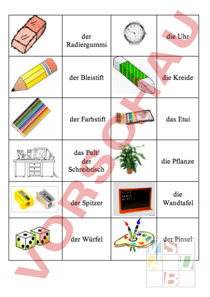 der Radiergummi die Uhr der Bleistift die Kreide der Farbstift das Etui das Pult/ der Schreibtisch die Pflanze der Spitzer die Wandtafel der Würfel der Pinsel der Ordner der Leim die Schere das Fenster die Türe die Leherin der Hauswart der Stuhl die Mappe das Heft das Buch der Hellraumprojektor der Schrank die Schublade der Filzstift die Flasche der Becher das Wasser Der Znüni der Pausenplatz die Zahl der Buchstabe schreiben lesen die Turnhalle die Kleider spielen lernen aufstrecken grüssen die Finken rennen die Füllfeder die Pausenglocke das Schulzimmer die Klasse