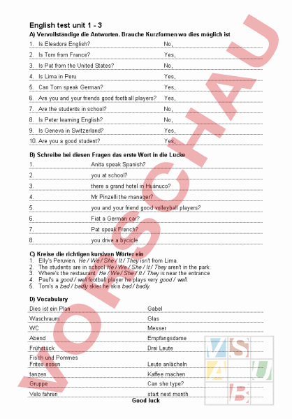 English test unit 1 3 A) Vervollständige die Antworten. Brauche Kurzformen wo dies möglich ist 1. Is Eleadora English? No, 2. Is Tom from France? Yes, 3. Is Pat from the United States? No, 4. Is Lima in Peru Yes, 5. Can Tom speak German? Yes, 6. Are you and your friends good football players? Yes, 7. Are the students in school? No, 8. Is Peter learning English? No, 9. Is Geneva in Switzerland? Yes, 10. Are you good student? Yes, B) Schreibe bei diesen Fragen das erste Wort in die Lücke 1. Anita speak Spanish? 2. you at school? 3. there grand hotel in Huánuco? 4. Mr Pinzelli the manager? 5. you and your friend good volleyball players? 6. Fiat German car? 7. Pat speak French? 8. you drive bycicle C) Kreise die richtigen kursiven Wörter ein 1. Elly Peruvien. He We She It They isnt from Lima. 2. The students are in school He We She It They arent in the park. 3. Where the restaurant. He We She It They is near the entrance 4. Paul good well football player he plays very good well. 5. Tom bad badly skier he skis bad badly. D) Vocabulary Dies ist ein Plan Gabel Waschraum Glas WC Messer Abend Empfangsdame Frühstück Drei Leute Fisch und Pommes Frites essen Leute anlächeln tanzen Kaffee machen Gruppe Can she type? Velo fahren start next month Good luck