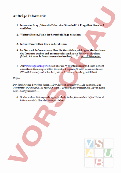 Aufträge Informatik 1. Internetauftrag „Virtuelle Exkursion Stromboli Frageblatt lösen und einkleben. 2. Weitere Reisen, Filme der Stromboli-Page besuchen. 3. Internettheorieblatt lesen und einkleben. 4. Im Net nach Informationen über die Geschichte, wichtigste Merkmale etc. des Internets suchen und zusammenfassend in ein Wordoc schreiben. ca.1/2 Seite mind. (Mind. 3-4 neue Informationen einschreiben) 5. Auf www.tagesanzeiger.ch sich über die Welt informieren und einen Bericht auswählen. Den ausgewählten Bericht mit eigenen Worten zusammenfassen (Worddokument) und schreiben, wieso du diesen Bericht gewählt hast. Hilfen: Der Titel meines Berichtes heisstDer Bericht handelt von Es geht umDie wichtigsten Punkte sind.Es fällt auf, dass Erschrocken/erstaunt bin ich vor allem über.Lustig/komisch. 6. Suche andere Zeitungswebpages (auch deutsche, österreichische)im Net und informiere dich über das Weltgeschehen.