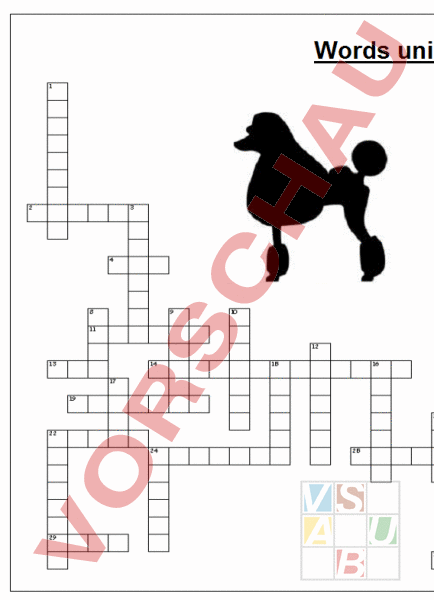 Words unit 15 Across 2. auch nicht, auch keine 4. Papi 7. frage uns 11. verlangen 13. kaufen 14. einen Pudel entführen 19. Problem 20. tausend 22. Geld 24. frage sie (die Personen) 25. Banknoten drucken 28. einladen 29. helfen 30. Hund Down 1. fantastisch 3. eine Bank ausrauben 5. Karten spielen 6. Kontakt aufnehmen 8. Dame 9. Polizei 10. unglücklich 12. suchen 15. frage ihn 16. Lotterie 17. lieben 18. vergessen 21. hassen 22. Mitternacht 23. goldener Ring 24. frage sie (die Frau) 26. gewinnen 27. verkaufen
