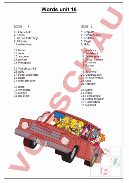 Words unit 16 Across Down 2. Unterschrift 4. Boden 8. Art des Fahrzeugs 9. Adresse 11. mitnehmen 1. Zeltplatz 2. Familienname 3. schlafen 5. Regel 6. Mofa 13. Karte 15. viele 17. ausgeben 22. parken 23. Reisepass 7. geradeaus 10. Schlafsack 12. Zelten gehen 14. Dinge, Sachen 16. Vorname 18. Partner 24. Verkehrsschild 25. nötig 27. Feuer anzünden 30. beide 31. links abbiegen 32. letzte 33. verlassen 36. Morgen 38. bis elf Uhr 19. überholen 20. Geburtsdatum 21. Antragsformular 26. Liste 28. Hubraum 29. Marke 31. Reise 33. Fahrausweis 34. rechts abbiegen 35. Hotelfuehrer 37. Motorrad
