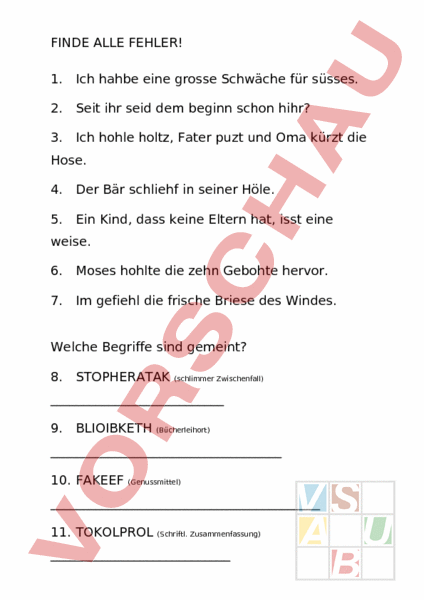 FINDE ALLE FEHLER! 1. Ich hahbe eine grosse Schwäche für süsses. 2. Seit ihr seid dem beginn schon hihr? 3. Ich hohle holtz, Fater puzt und Oma kürzt die Hose. 4. Der Bär schliehf in seiner Höle. 5. Ein Kind, dass keine Eltern hat, isst eine weise. 6. Moses hohlte die zehn Gebohte hervor. 7. Im gefiehl die frische Briese des Windes. Welche Begriffe sind gemeint? 8. STOPHERATAK (schlimmer Zwischenfall) 9. BLIOIBKETH (Bücherleihort) 10. FAKEEF (Genussmittel) 11. TOKOLPROL (Schriftl. Zusammenfassung) 12. PAIEOMONRTEN (Geldbörse) 13. GRIPUSPEVIR (Krankheitsauslöser) 14. THELEKADAR (grosse Kirche) 15. DAMEILLE (Auszeichnung im Sport)