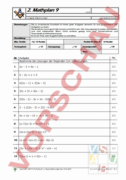 2. Mathplan 9 Name: Lineare Gleichungen Bemerkungen: Lernzielkontrolle 1 Die zu erreichende Punktzahl ist hinter jeder Aufgabe vermerkt. Es sind grundsätzlich alle Aufgaben zu lösen. Die einzelnen Lösungsschritte müssen ersichtlich sein. Der Lösungsweg ist sauber darzustellen und wird mitbewertet. Wenn nichts anderes gesagt wird, sind Taschenrechner und Theorieheft als Hilfsmittel erlaubt. Es ist mit Tinte oder Kugelschreiber zu schreiben. Beurteilung: Max. Punkte 12 12 Punkte Testergebnis: 12 Punkte für Note 4: Lösungsweg: 12 Gesamtpunkte: 16 Punkte 24 Note: Nr. Aufgabe Bestimme die Lösungen der folgenden (Un-)Gleichungen. Pkt 1. 2x – 3 6x – 1 1/1 2. 5 – 2x x 5 1/1 3. 4(2x – 1) 3(3x – 3) 1/1 4. 3(x 5) 6(x – 2) 1/1 5. 3(5x 2) 3x 3x 3(5x 2) 1/1 6. 2 1.2(2x 3) 2(2 0.8x) 1/1 7. 4x 2x – 15 -4 3x – 2 1/1 8. (x-7)(x-3) (x-4)2 12 1/1 9. (2x1)(x-2) 2(x-1)2 1/1 10. (x-4)2 –x(x-3) 4x – 8(x-2) 1/1 11. (2x 1)(x – 3) x2 – x(4 – x) 1/1 12. 7(x1) x 5(x – 1) 1/1 20070204-183947MP_9S-02_ZT1_lineare_Gleichungen.doc; 04.02.2007 Schule Ringgenberg, Sek-Stufe 1; st