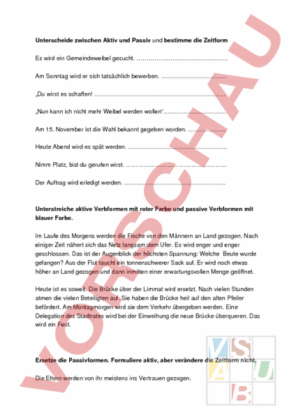 Unterscheide zwischen Aktiv und Passiv und bestimme die Zeitform Es wird ein Gemeindeweibel gesucht. . Am Sonntag wird er sich tatsächlich bewerben. „Du wirst es schaffen! „Nun kann ich nicht mehr Weibel werden wollen Am 15. November ist die Wahl bekannt gegeben worden. . Heute Abend wird es spät werden. Nimm Platz, bist du gerufen wirst. Der Auftrag wird erledigt werden. Unterstreiche aktive Verbformen mit roter Farbe und passive Verbformen mit blauer Farbe. Im Laufe des Morgens werden die Fische von den Männern an Land gezogen. Nach einiger Zeit nähert sich das Netz langsam dem Ufer. Es wird enger und enger geschlossen. Das ist der Augenblick der höchsten Spannung: Welche Beute wurde gefangen? Aus der Flut taucht ein tonnenschwerer Sack auf. Er wird noch etwas höher an Land gezogen und dann inmitten einer erwartungsvollen Menge geöffnet. Heute ist es soweit. Die Brücke über der Limmat wird ersetzt. Nach vielen Stunden atmen die vielen Beteiligten auf. Sie haben die Brücke heil auf den alten Pfeiler befördert. Am Montagmorgen wird sie dem Verkehr übergeben werden. Eine Delegation des Stadtrates wird bei der Einweihung die neue Brücke überqueren. Das wird ein Fest. Ersetze die Passivformen. Formuliere aktiv, aber verändere die Zeitform nicht. Die Eltern werden von ihr meistens ins Vertrauen gezogen. Der Schwingerkönig wird von der ganzen Gemeinde gefeiert worden sein. . Immer wieder wurde diese Türe zugeschlagen. . Die Türe ist von der Hauswartin jeden Abend geschlossen worden. . Deutschprobe Punkte: Name: Note: AKTIV UND PASSIV Setze die folgenden Sätze ins Aktiv oder Passiv. Achte darauf, dass die Zeitform bei der Umwandlung nicht verändert wird. Lass den „Täter im Passiv weg. Peter hilft dem Verletzten. Zeitform: Sie hat die Tür geöffnet. Zeitform: Man hat ihrem Gesuch entsprochen. Zeitform: Sie verliessen die Stadt sofort. Zeitform: . Alle Aufgaben waren richtig gelöst worden. Zeitform: Der Arzt wird den Patienten untersuchen. Zeitform: Das Auto wird abgeschleppt worden sein. Zeitform: Die Meldungen haben uns verunsichert. Zeitform: . Sie hatte ihre Eltern ins Vertrauen gezogen. Zeitform: . Der Pannendienst wird das Auto abschleppen. Zeitform: