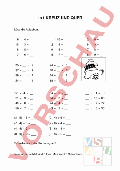 1x1 KREUZ UND QUER Löse die Aufgaben. 6 4 1 10 2 8 10 3 2 4 6 3 8 8 9 6 7 8 7 6 8 7 6 9 35 7 24 3 27 9 48 8 56 7 54 6 24 4 18 3 12 4 54 6 21 3 64 8 10 80 40 8 24 4 7 77 56 7 3 3 6 30 (3 5) 5 (9 4) 6 (7 4) 3 (7 6) 4 (4 8) 2 (6 6) 4 (8 9) 9 (5 9) 6 Schreibe auch die Rechnung auf! In einer Schachtel sind 6 Eier. Mira kauft 5 Schachteln. 4 0 Auf einer Weide sind 4 Schafe und 4 Hühner. Wie viele Beine sind das?