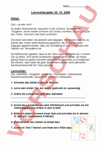 Name: Lernwörterzettel, 30. 10. 2006 Diktat: Zoo – ja oder nein? An jedem Wochenende besuchen in der Schweiz Tausende die Tiergärten. Immer wieder erfreuen sich Gross und Klein, Alt und Jung an den Tieren. Dennoch sind Zoos umstritten. Die einen sind dafür, die anderen sind dagegen. So meinen manche, es könnte den Tieren nichts Besseres passieren, als im Zoo zu leben. Dagegen glauben andere, dass die Tierhaltung im Zoo im Grossen und Ganzen nur Tierquälerei sei. Die Befürworter glauben, dass es für Tiere sogar das Beste sei, in einem Zoo zu leben. Dort werde schliesslich alles Mögliche getan, um ihnen genug Raum zu geben und eine natürliche Lebensweise zu ermöglichen. Sie meinen, dass dafür die gute Gesundheit und die recht zahlreiche Nachkommenschaft der Tiere spreche. Lernwörter: Zoo, umstritten, Tiergarten, passieren, Tierquälerei, Lebensweise, Nachkommenschaft, Gesundheit, zahlreich, schliesslich. 1. Schreibe das Diktat in dein D- Heft ein. 2. Lerne den ersten Teil, der kursiv gedruckt ist, auswendig. 3. Ordne die Lernwörter nach dem Alphabet: 4. Suche die Lernwörter aus dem Wörterbuch und schreibe sie mit Seitenangabe und Artikel in dein D-Heft. 5. Bilde mit jedem Lernwort einen Satz und schreibe ihn in deinem D- Heft auf. (mindestens 6 Wörter) 6. Unterstreiche die Verben im Diktat blau. 7. Suche im Text 7 Nomen und finde die 4 Fälle dazu.