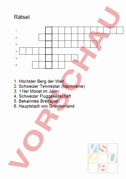 Rätsel (Lösung) 1 2 3 4 5 6 1. 2. 3. 4. 5. 6. SW S A E S H U T V R S D R R V M E H C E Höchster Berg der Welt Schweizer Tennisstar (Nachname) 11ter Monat im Jahr Schweizer Fluggesellschaft Bekanntes Brettspiel Hauptstadt von Griechenland Rätsel 1 2 3 4 5 6 1. Höchster Berg der Welt 2. Schweizer Tennisstar (Nachname) 3. 11ter Monat im Jahr 4. Schweizer Fluggesellschaft 5. Bekanntes Brettspiel 6. Hauptstadt von Griechenland