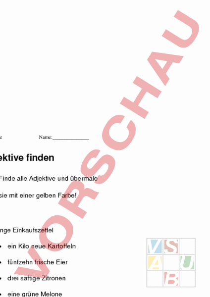 Adjektive Name:_ Adjektive finden Finde alle Adjektive und übermale sie mit einer gelben Farbe! Der lange Einkaufszettel • ein Kilo neue Kartoffeln • fünfzehn frische Eier • drei saftige Zitronen • eine grüne Melone • eine kleine Dose Ananas • ein schöner Kopfsalat • zwei reife Bananen • ein Beutel gedörrte Zwetschgen • vier weiche Kiwi Adjektive Name:_ • eine Packung tiefgekühlte Erbsen • ein Stück mageres Rindfleisch • eine Tafel dunkle Schokolade • eine Flasche saurer Most • eine Tüte geschälter Mandeln