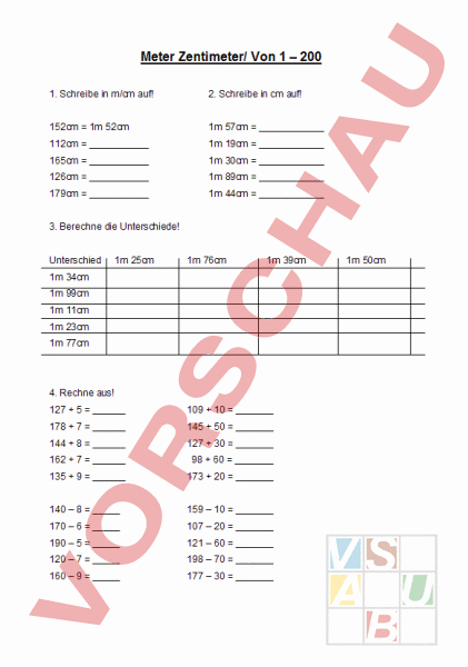 Meter Zentimeter/ Von 1 – 200 1. Schreibe in m/cm auf! 2. Schreibe in cm auf! 152cm 1m 52cm 1m 57cm 112cm 1m 19cm 165cm 1m 30cm 126cm 1m 89cm 179cm 1m 44cm 3. Berechne die Unterschiede! Unterschied 1m 25cm 1m 76cm 1m 39cm 1m 34cm 1m 99cm 1m 11cm 1m 23cm 1m 77cm 4. Rechne aus! 127 5 109 10 178 7 145 50 144 8 127 30 162 7 98 60 135 9 173 20 140 – 8 159 – 10 170 – 6 107 – 20 190 – 5 121 – 60 120 – 7 198 – 70 160 – 9 177 – 30 1m 50cm