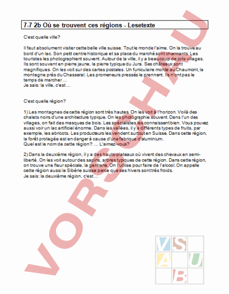 7-7 2b Où se trouvent ces régions Lesetexte Cest quelle ville? Il faut absolument visiter cette belle ville suisse. Tout le monde Iaime. On la trouve au bord dun lac. Son petit centre historique et sa place du marché sont charmants. Les touristes les photographient souvent. Autour de la ville, il a beaucoup de jolis villages. Ils sont souvent en pierre jaune, la pierre typique du Jura. Ses châteaux sont magnifiques. On les voit sur des cartes postales. Un funiculaire monte au Chaumont, la montagne près du Chasseral. Les promeneurs pressés le prennent. Ils nont pas le temps de marcher . Je sais: la ville, cest . Cest quelle région? 1) Les montagnes de cette région sont très hautes. On les voit à Ihorizon. Voilà des chalets noirs dune architecture typique. On les photographie souvent. Dans Iun des villages, on fait des masques de bois. Les spécialistes les connaissent bien. Vous pouvez aussi voir un lac artificiel énorme. Dans les vallées, il a différents types de fruits, par exemple, les abricots. Les producteurs les vendent surtout en Suisse. Dans cette région, la forêt protegée est en danger à cause dune fabrique daluminium. Quel est le nom de cette région?: . Laimez-vous? 2) Dans la deuxième région, il a des hauts-plateaux où vivent des chevaux en semiliberté. On les voit autour des sapins, arbres typiques de cette région. Dans cette région, on trouve une fleur spéciale, la gentiane. On Iutilise pour faire de Ialcool. On appelle cette région aussi la Sibérie suisse parce que ses hivers sont très froids. Je sais: la deuxième région, cest .