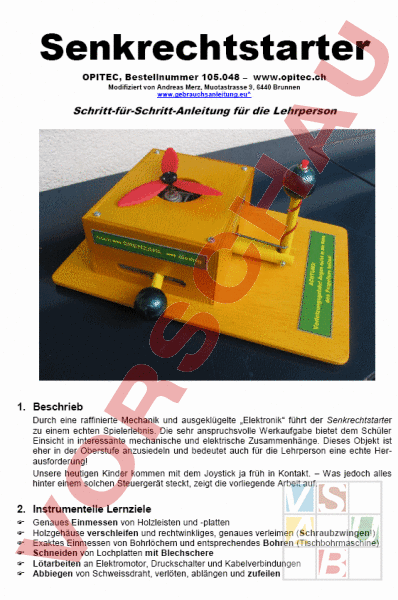 Durch eine raffinierte Mechanik und ausgeklügelte „Elektronik“ führt der Senkrechtstarter zu einem echten Spielerlebnis. Die sehr anspruchsvolle Werkaufgabe bietet dem Schüler Einsicht in interessante mechanische und elektrische Zusammenhänge. Dieses Objekt ist eher in der Oberstufe anzusiedeln und bedeutet auch für die Lehrperson eine echte Herausforderung!
