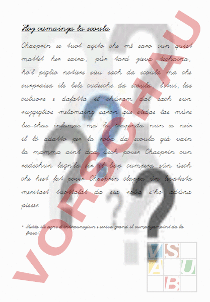 Hoz cumainza la scoula Chasprin es tuot agito che mê saro cun quist mattet her saira, pür tard zieva tschaina, hol piglio notiers sieu sach da scoula ma che surpraisa ils bels cudeschs da scoula, letui, las culuors dafatta il chüram dal sach sun ruzgiglios melamaing saron que stedas las mürs bes-chas infamas ma la crapenda nun es neir il lö adatto per la roba da scoula già vain la mamma aint dad üsch pover Chasprin cun radschun lagnla eir il bap cumpera sün üsch che hest fat pover Chasprin clappa ün levatesta meritast tuottafat da sia roba sho adüna pisser Metta ils segns dinterpuncziun scriva grand il cumanzamaint da la frasa!