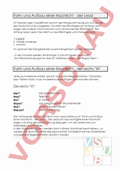 Form und Aufbau einer Nachricht der Lead Im Theater oder in Spielfilmen kommt der Höhepunkt häufig am Schluss. Bei der Nachricht ist es umgekehrt. Da steht das Wichtigste am Anfang; dann folgen die anderen Informationen nach abnehmender Wichtigkeit. Der Anfang heisst Lead. Hier steht nur das Wichtigste und Interessanteste. 1. Lead 2. nähere Umstände 3. Einzelheiten Im Lead soll der Kerngedanken zusammengefasst werden. Beispiele: „In der Schweiz werden die Biotope in Zukunft besser geschützt. „Am Wochenende gab es über 20 Verkehrsunfälle in der Region Bern. Form und Aufbau einer Nachricht die sechs W Jede journalistische Arbeit, die sich auf wahre Begebenheiten, Tatsachen bzw. Fakten stützt, muss mindestens sechs Fragen beantworten können: Die sechs W: Wer? Was? Wo? Wann? Wie? Warum? Die Spielerinnen feierten in Zürich am vergangenen Wochenende unter Freudentränen ihren Turniersieg. Den Anfang der Nachricht nennt man Lead (siehe auch Form und Aufbau einer Nachricht der Lead). Der Lead soll das wichtigste einer Nachricht sagen und eine gewisse Spannung erzeugen, um die LeserInnen zum weiterlesen zu animieren. In den folgenden Sätzen werden dann nähere Umstände beschrieben, u.a. werden die sechs vollständig beantwortet. Schliesslich können Einzelheiten und spezielle Begebenheiten erwähnt werden. Sprechen am Radio Wir wollen gute Radiosendungen ausstrahlen können. Unser Publikum soll die Sendungen ohne Schwierigkeiten verstehen können. Das ist gar nicht so einfach. Im Gegensatz zum Medium Zeitung kann eine Zuhörerin nicht zurückblättern, etwas noch einmal lesen und etwa in Ruhe in einem Wörterbuch nachschlagen; kommt sie zurück zu ihrem Radio, hat sie so viel verpasst, dass sie den Zusammenhang längstens verloren hat. Eine Voraussetzung für gute Verständlichkeit ist die Fähigkeit, Texte gliedern zu können und die Sinnschritte rhythmisch darzustellen. Jeder Satz, jeder Abschnitt lässt sich in sinnvolle Untereinheiten, in Sinnschritte, aufteilen, die beim Hören erkennbar sein sollen. Im folgenden Beispiel 1 ist eine solche Unterteilung durch Querstriche angegeben: Zu einer Reise durch die Wüste/ brauchte man unbedingt zweierlei:/ Wasser und Salz./ In der Nähe von Dunfang/ gibt es kleine Seen,/ aus denen noch heute Salz gewonnen wird / wie zu Zeiten der Seidenstrasse./ Damals wie heute/ eine Knochenarbeit/ in glühender Hitze./ An Wasser/ fehlte es den meisten Oasen/ am Rande der Wüste Taklamakan/ nicht./ Von den hohen Gebirgen/ rund um die Wüste/ mit ihrem ewigen Schnee und Eis/ strömten das ganze Jahr über/ Bäche und Flüsse/ in die Oasen hinab/ und weiter in die Wüste,/ wo sie dann bald im Sand versickerten./ Sinnschritte ergeben sich auch aus dem Inhalt des Textes. Im letzten Satz ist der Teil „mit ihrem ewigen Schnee und Eis eingeschoben. Dieser Teil hat nicht die gleiche Wichtigkeit wie der Rest des Satzes. Solche eingeschobene Satzteile und Nebensätze werden mit etwas gesenkter Stimme gesprochen, etwas schneller und oberflächlicher als der Rest des Satzes. Viele Sprecher scheinen zu schnell zu lesen. In Tat und Wahrheit verwischen sie meistens die Pausen und wechseln den Sprechrhythmus nie. Der folgende Satz enthält einen Hauptsatz und einen Nebensatz: In der Nähe von Dunfang/ gibt es kleine Seen,/ aus denen noch heute Salz gewonnen wird. Alles, was auf das betonte Wort „heute folgt, wird relativ schnell und mit sinkender Stimme gelesen. Nicht bei jedem Punkt wird eine Pause gemacht. Die Pause hat dann Sinn, wenn man wichtige Gedanken wirken lassen will. Man soll den Sätzen also eine Melodie geben. Nicht alle Sätze sollen die gleiche Melodie und den gleichen Rhythmus haben; das wirkt langweilig und traurig. Die Satzmelodie muss sich manchmal über die Zeichengebung hinwegsetzen. Das folgende Beispiel beginnt mit zwei kurzen Sätzen. Der dritte Satz gehört aber gedanklich eng zum zweiten. Dies muss die Sprecherin zu erkennen geben, indem sie schnell weiterliest: Manche Familien züchten Ziegen und Schafe. Ô Die meisten Tiere gehörten bislang Volkskommunen.Î Doch allmählich gehen nun die Herden in Familieneigentum über. Der waagrechte Pfeil bedeutet: Hier soll die Satzmelodie nicht völlig gesenkt werden. Wenn sie ganz leicht angehoben bleibt, weist sie auf den Anschlusssatz hin. In jedem Satz ist ein Wort am stärksten vorgehoben. Es wird betont. Betont wird das Wort, das die neue Information liefert. 1 Die Beispiele entstammen folgendem Buch: Häusermann, Jürg Heiner Käppeli: Rhetorik für Radio und Fernsehen. Schriften zur Medienpraxis, hrsg. vom Medienausbildungszentrum Luzern. Aarau: Sauerländer 1994. Im folgenden Satz werden sogar zwei Wörter betont: Kara Koto heisst Schwarze Stadt. Es lohnt sich, in einen Text, den man am Radio sprechen will und der als Manuskript vorliegt, einige Zeichen einzufügen, die einem helfen sollen, die richtige Melodie und den richtigen Rhythmus zu finden. In erster Linie sollte man sehr wichtige Betonungen und weniger wichtige Betonungen anzeigen. Wichtige Sprechpausen (mit ‘) sind ebenso zu markieren, wie Stellen, wo man schnell weiterlesen sollte: Î. Ein nach unten gerichteter Pfeil (Ð) macht darauf aufmerksam, dass die Stimme auf den Punkt gesenkt werden soll. Klammern (.) zeigen an Einschübe und Nebensätze an, die schneller und tiefer gesprochen werden sollen. Auftrag Versuche den folgenden Text mit den Markierungen lesend zu gestalten! Zu einer Reise durch die Wüste brauchte man unbedingt zweierlei: Î Wasser und Salz.Ð In der Nähe von Dunfuang ‘ gibt es kleine Seen, aus denen noch heute Salz gewonnen wird wie zu Zeiten der Seidenstrasse. (Damals wie heute ‘ eine Knochenarbeit in glühender Hitze.) Ð An Wasser ‘ fehlte es den meisten Oasen am Rand der Wüste Takla-Makan nicht. Von den hohen Gebirgen rund um die Wüste ‘ (mit ihrem ewigen Schnee und Eis) ‘ strömten das ganze Jahr über Bäche und Flüsse in die Oasen hinab und weiter in die Wüste, ‘ (wo sie dann ba
