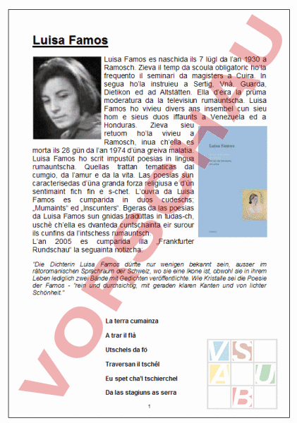 Luisa Famos Luisa Famos es naschida ils 7 lügl da lan 1930 Ramosch. Zieva il temp da scoula obligatoric hola frequento il seminari da magisters Cuira. In segua hola instruieu Sertig, Vnà, Guarda, Dietikon ed ad Altstätten. Ella deira la prüma moderatura da la televisiun rumauntscha. Luisa Famos ho vivieu divers ans insembel cun sieu hom sieus duos iffaunts Venezuela ed Honduras. Zieva sieu retuorn hola vivieu Ramosch, inua chella es morta ils 28 gün da lan 1974 düna greiva malatia. Luisa Famos ho scrit impustüt poesias in lingua rumauntscha. Quellas trattan tematicas dal cumgio, da lamur da la vita. Las poesias sun caracterisedas düna granda forza religiusa dün sentimaint fich fin s-chet. Louvra da Luisa Famos es cumparida in duos cudeschs; „Mumaints ed „Inscunters. Bgeras da las poesias da Luisa Famos sun gnidas tradüttas in tudas-ch, uschè chella es dvanteda cuntschainta eir surour ils cunfins da lintschess rumauntsch. Lan 2005 es cumparida illa „Frankfurter Rundschau la seguainta notizcha: Die Dichterin Luisa Famos dürfte nur wenigen bekannt sein, ausser im rätoromanischen Sprachraum der Schweiz, wo sie eine Ikone ist, obwohl sie in ihrem Leben lediglich zwei Bände mit Gedichten veröffentlichte. Wie Kristalle sei die Poesie der Famos rein und durchsichtig, mit geraden klaren Kanten und von lichter Schönheit. La terra cumainza trar il flà Utschels da fö Traversan il tschêl Eu spet chal tschierchel Da las stagiuns as serra 1 Mieu nom Mieu nom es Randulina Opür eau vuless almain Da sted chaunti bodezzas Suot la pensla Chanzuns per vus Ed aunz chal sulagl vo adieu Stun sül piz dal clucher Per as vzair pü bain. 2 Ün dals utschels predilets da Luisa Famos deira la randulina. Tschercha infurmaziuns sur da quist utschè scriva quellas scu tuor da pleds. Forsa at grattagia que perfin da furmer alura üna bella poesia. 3 Fo uossa ün mind-map cullas infurmaziuns importantas da la poetessa Luisa Famos. Luisa Famos 4