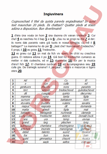 Ingiuvinera Cugnuoschast il titel da quista parevla engiadinaisa? In quist text maunchan 20 pleds. Ils chattast? Quatter pleds at staun adüna dispusiziun. Bun divertimaint! 1 deira üna vouta ün hom 2 üna duonna chi vaivan tredesch 3. Cur chal 4 es naschieu ho il bap 5 la 6: „Eau nu se propi na che 7 al der; ils noms dals paraints vains già tuots in nossa famiglia; cu mê il 8 battager? La mamma ho do per 9: „Sest che? Numnainsal Tredeschin. propi, il 10 es gnieu 11 Tredeschin. 12 es gnieu cul 13 ün mat da fich viv spiert, be chel nu creschiva guera. El restaiva adüna il pü 14. Già bod ho Tredeschin cumanzo as metter vi dals cudeschs, ed el 15 stupendas 16. Eir per la musica deiral fich 17: El chantaiva ourdvart 18 ed accumpagnaiva sieu 19 culla gïa. Da tramegls sunaival il „langaus, valzers mazurcas bgers oters 20. 1 2 3 4 5 6 7 8 9 10 11 12 13 14 15 16 17 18 19 20 Ad genituors terz dit mamma surnom stuvains respus matta battagio Lucky Luke ans grand quintaiva artichels debel fos quint sots cun iffaunts setevel cussglio nona schlatta pudains resposta abiedi battageda Tredeschin ura larg chantaiva inserats talento bun gimnastica sagls Cu culla nons tredeschevel quinto tanta battaisem vulains dit figlia numneda Asterix temp pitschen sinsömgiaiva manzögnas suord buna chaunt saltos El ed paraints quindeschevel discurrieu figlia nom savains dumanda mat clameda Donald Duck eivnas lung stüdgiaiva parevlas musical bain musica exercizis