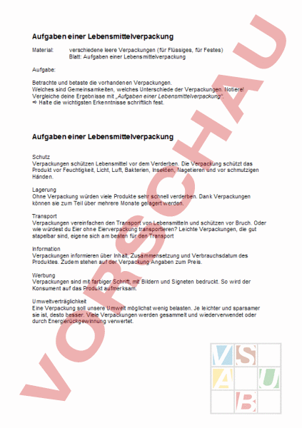 Aufgaben einer Lebensmittelverpackung Material: verschiedene leere Verpackungen (für Flüssiges, für Festes) Blatt: Aufgaben einer Lebensmittelverpackung Aufgabe: Betrachte und betaste die vorhandenen Verpackungen. Welches sind Gemeinsamkeiten, welches Unterschiede der Verpackungen. Notiere! Vergleiche deine Ergebnisse mit „Aufgaben einer Lebensmittelverpackung. Ö Halte die wichtigsten Erkenntnisse schriftlich fest. Aufgaben einer Lebensmittelverpackung Schutz Verpackungen schützen Lebensmittel vor dem Verderben. Die Verpackung schützt das Produkt vor Feuchtigkeit, Licht, Luft, Bakterien, Insekten, Nagetieren und vor schmutzigen Händen. Lagerung Ohne Verpackung würden viele Produkte sehr schnell verderben. Dank Verpackungen können sie zum Teil über mehrere Monate gelagert werden. Transport Verpackungen vereinfachen den Transport von Lebensmitteln und schützen vor Bruch. Oder wie würdest du Eier ohne Eierverpackung transportieren? Leichte Verpackungen, die gut stapelbar sind, eigene sich am besten für den Transport Information Verpackungen informieren über Inhalt, Zusammensetzung und Verbrauchsdatum des Produktes. Zudem stehen auf der Verpackung Angaben zum Preis. Werbung Verpackungen sind mit farbiger Schrift, mit Bildern und Signeten bedruckt. So wird der Konsument auf das Produkt aufmerksam. Umweltverträglichkeit Eine Verpackung soll unsere Umwelt möglichst wenig belasten. Je leichter und sparsamer sie ist, desto besser. Viele Verpackungen werden gesammelt und wiederverwendet oder durch Energierückgewinnung verwertet.