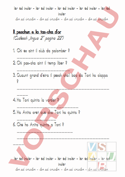 ler ed incler – ler ed incler ler ed incler – ler ed incler ler ed incler ler ed incler – ler ed incler ler ed incler – ler ed incler Il peschun la tas-cha dor (Cudesch „lingua 2 pagina 22) 1. Chi es aint il club da palomber 2. Chi pas-cha aint il temp liber 3. Quaunt grand deira il pesch chal bap da Toni ho clappo 4. Ho Toni quinto la vardet 5. Ho Anita cret que cha Toni ho quinto 6. Che ho Anita quinto Toni ler ed incler – ler ed incler ler ed incler – ler ed incler ler ed incler ler ed incler – ler ed incler ler ed incler – ler ed incler ler ed incler – ler ed incler ler ed incler – ler ed incler ler ed incler ler ed incler – ler ed incler ler ed incler – ler ed incler 7. Che ho Toni stuvieu ingiuviner 8. Ingiuvina eir tü (trais pussibilteds) o ler ed incler – ler ed incler ler ed incler – ler ed incler ler ed incler ler ed incler – ler ed incler ler ed incler – ler ed incler