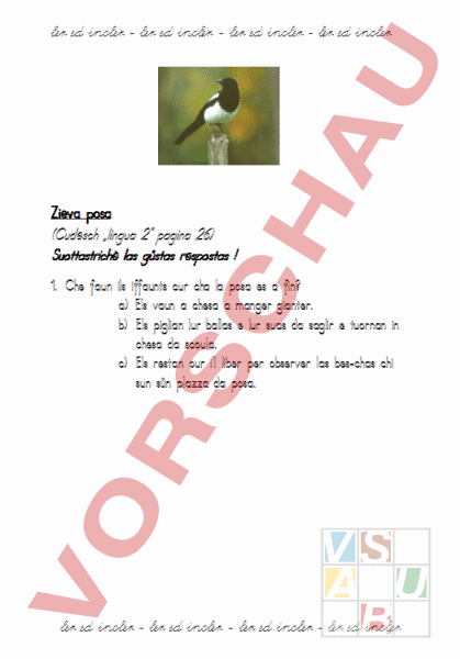 ler ed incler – ler ed incler ler ed incler – ler ed incler Zieva posa (Cudesch „lingua 2 pagina 26) Suottastrichè las güstas respostas 1. Che faun ils iffaunts cur cha la posa es fin? a) Els vaun chesa manger gianter. b) Els piglian lur ballas lur suas da saglir tuornan in chesa da scoula. c) Els restan our il liber per observer las bes-chas chi sun sün plazza da posa. ler ed incler – ler ed incler ler ed incler – ler ed incler ler ed incler – ler ed incler ler ed incler – ler ed incler 2. Che capita uossa sün plazza da posa? a) vain quiet. b) passa ün camiun. c) La prüma classa vain fer ün gö. 3. Che utschè as tschainta sül ur düna sadella da rüt? a) Ün pasler b) Üna giaza c) Ün aivla 4. Che chatta quel utschè aint illa sadella da rüt? a) Ün pêr mievlas b) Üna tschiculatta c) Ün pom mez mangio ler ed incler – ler ed incler ler ed incler – ler ed incler