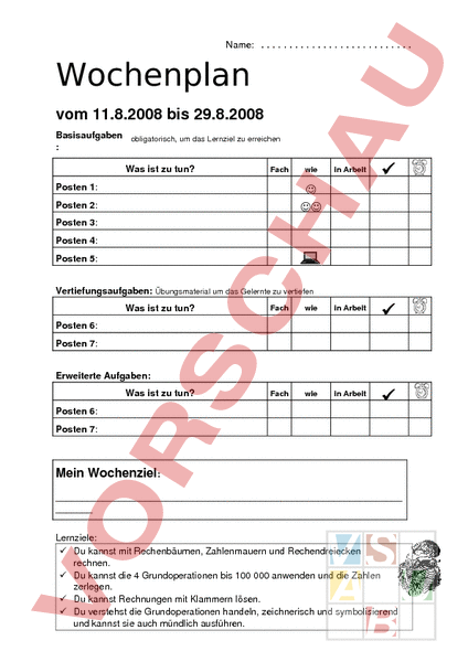 Name: . Wochenplan vom 11.8.2008 bis 29.8.2008 Basisaufgaben obligatorisch, um das Lernziel zu erreichen Was ist zu tun? Fach Posten 1: wie in Arbeit Posten 2: Posten 3: Posten 4: Posten 5: Vertiefungsaufgaben: Übungsmaterial um das Gelernte zu vertiefen Was ist zu tun? Fach wie in Arbeit Fach wie in Arbeit Posten 6: Posten 7: Erweiterte Aufgaben: Was ist zu tun? Posten 6: Posten 7: Mein Wochenziel: Lernziele: Du kannst mit Rechenbäumen, Zahlenmauern und Rechendreiecken rechnen. Du kannst die 4 Grundoperationen bis 100 000 anwenden und die Zahlen zerlegen. Du kannst Rechnungen mit Klammern lösen. Du verstehst die Grundoperationen handeln, zeichnerisch und symbolisierend und kannst sie auch mündlich ausführen. Name: . Hausaufgaben Zu lösen auf: Dienstag, 12.08 Mittwoch, 13.08 Donnerstag, 14.08 Freitag, 15.08 Dienstag, 19.08 Aufgabe: Ü. S.8/9 Infotext lesen ZB S.4 exakt arbeiten Malschürze mitnehmen Elternbrief abgeben Musikmäppli mitnehmen (mit Goethe mal anders Lieder) Ü. S.10 und 11 alle Hefte und Bücher anschreiben/ Bücher einbinden mind. 1 Posten der Werkstatt 4 Wortarten lösen. Gib deiner Lehrperson an, welchen Posten du löst. Elternbrief abgeben Mittwoch, 20.08 Donnerstag, 21.08 40 Minuten lesen und eine Kurzzusammenfassung ins Deutschheft schreiben. Löse mindestens 1 Wochenplanposten lösen. Gib deiner Lehrperson an, welchen Posten du löst. Mein Aufsatzhelfer ausmalen und Freitag, 22.08 Dienstag, 26.08 Mittwoch, 27.08 gestalten (nur mit Farbstift!) Sporttag am Nachmittag Repetiere die Reihen und schreibe die schwierigsten in dein Matheheft (mind. 3 Reihen) am Vortrag arbeiten Löse das Arbeitsblatt Kennst du die Zahlen& Ballonfahrt Infos für den Planetenvortrag mitnehmen Löse das Arbeitsblatt Donnerstag, 28.08 Grundbausteine der Rechtschreibung Weiterfahren bei der letzten Aufgabe. Name: . Freitag, 29.08 Matheprüfung zu den Grundoperationen Profitiere von den Übungsblättern Unterschrift der Eltern:_