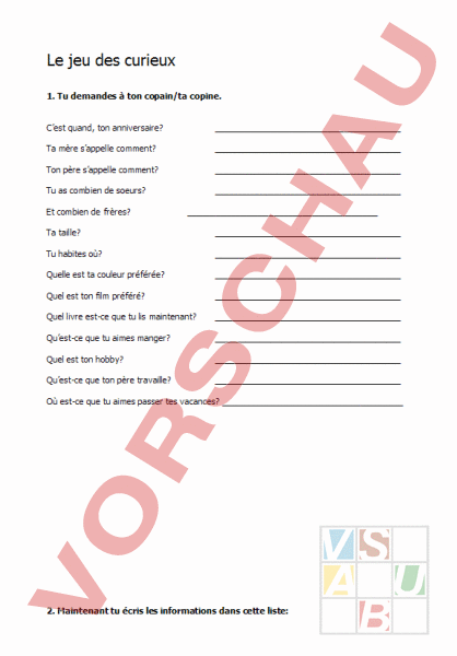 Le jeu des curieux 1. Tu demandes à ton copain/ta copine. Cest quand, ton anniversaire? Ta mère sappelle comment? Ton père sappelle comment? Tu as combien de soeurs? Et combien de frères? Ta taille? Tu habites où? Quelle est ta couleur préférée? Quel est ton film préféré? Quel livre est-ce que tu lis maintenant? Quest-ce que tu aimes manger? Quel est ton hobby? Quest-ce que ton père travaille? Où est-ce que tu aimes passer tes vacances? 2. Maintenant tu écris les informations dans cette liste: XY son anniversaire le La mère de XY sappelle Le père de XY sappelle XY soeur(s) et frère(s). XY mesure XY habite à est la couleur préférée de XY est le film préféré de XY XY lit maintenant le livre avec le titre Le plat préféré de XY cest est le hobby de XY Le père de XY est XY aime passer les vacances 3. Tu lis ces informations et les autres devinent de qui est-ce que tu parles.