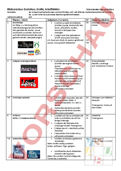 Bildnerisches Gestalten: Grafik, Schriftbilder Grobziele: Lektionenumfang: Schreibunterlage gestalten Gz: 6 Neue Buchstabenformen und Schriftbilder, evtl. mit Hilfe der Buchstabenschablonen erfinden. Gz. 12 Die Farbe als autonomes Gestaltungsmittel einsetzen. 6‐8 Thema ‐ Inhalt Aufgaben Lernziele SF Material‐Medien 1 Schriftbilder Im Alltag, v.a. Werbung gibt es viele Gestaltungsarten der Schriften. Man gestaltet die Wörter, um sie anschaulich zu machen. Damit soll auch die Aufmerksamkeit des Lesers geweckt werden. (Beispiele zeigen) suchen zu zweit verschiedene Schriften (runde, Blockschrift, fett, kursiv, altmodisch, modern, barock) in Zeitungen bzw. Katalogen · zeigen eine ihrer gefundenen Schrift und äussern sich dazu: z:B. Passt zum Inhalt, ist neutral, gefällt evtl. warum, hat zusätzlich Bildzeichen PA Zeitungen, Kataloge Schere 2 Aufgabe Unterlage erklären · · · · 3‐6 Unterlage ausmalen 6 Foliieren Selbst‐ Fremdbeurteilung 7‐8 Weiterführendes schreiben mit verschieden Schriften den eigenen Namen (gross) benützen evtl. Schablonen als Hilfsmittel (zuerst sorgfältig ausschneiden) schreiben ihren Namen mit ihrer Favoritenschrift mit Bleistift gross auf Unterlage, achten dabei auf Platzverhältnisse: Buchstaben Grösse Unterlage aufräumen und putzen achten beim Ausmalen, dass der Name gut lesbar bleibt à Kontraste beachten à1. hell 2. dunkel · Buchstaben deckend ausmalen · Hintergrund deckend ausmalen · aufräumen und putzen · melden sich bei Lp schneiden die Folie zu und kleben sie auf ihre fertige Unterlage · radieren die Rückseite ihrer Unterlage mit dem Tintengummi · kleben das A3 – Merkblatt auf die Rückseite · besprechen ihre Arbeit mit Lp · aufräumen und putzen · Schriften als Gestaltungselement verwenden Ideen: Wolke: wolkig schreiben Butter: zerflossen Tiger: getigert. · Schriftzeichen durch Bildzeichen ersetzen oder ergänzen Ideen: Pilz aus dem wird ein Fliegenpilz Tunnel das umdrehen · KU GA EA Entwurfsblätter Bleistift Unterlage evtl. Schablonen Schere EA Zeitungen zum Abdecken Neocolor Tintengummi, Farbe auf dem Boden EA LP Klebefolie Tintengummi EA Zeichenpapier Neocolor oder Farbstifte