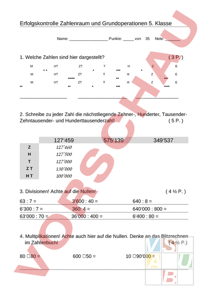 Erfolgskontrolle Zahlenraum und Grundoperationen 5. Klasse Name: Punkte: von 35 Note: 1. Welche Zahlen sind hier dargestellt? HT ZT •• • HT ZT HT ZT • • •• •• ••• ••••• •• 3 P. ••• ••• •••• 2. Schreibe zu jeder Zahl die nächstliegende Zehner-, Hunderter, TausenderZehntausender- und Hunderttausenderzahl! 5 P. H ZT HT 127‘459 127‘460 127‘500 127‘000 130‘000 100‘000 575‘139 349‘537 3. Divisionen! Achte auf die Nullen! 4 P. 63 7 3‘600 40 640 8 6‘300 7 360: 4 640‘000 800 63‘000 70 36‘000 400 6‘400 80 4. Multiplikationen! Achte auch hier auf die Nullen. Denke an das Blitzrechnen im Zahlenbuch! 4 P.) 80 € 80 600 € 50 10 € 90‘000 800 € 400 5 € 80‘000 3‘000 € 30 60 € 60‘000 1‘000 € 1‘000 70 € 700 5. Löse folgende Subtraktionen: 4 P. 1‘000 – 1 100‘000 – 4 10‘000 – 1 100‘000 – 40 100‘000 – 1 100‘000 – 400 1‘000‘000 – 1 100‘000 – 4000 6. Fülle die beiden Tabellen aus: Zahl das Doppelte 22‘440 Zahl die Hälfte 48‘000 8 P. 55‘000 18‘000 55‘000 22‘400 12‘600 775 7. Löse diese schriftlichen Grundoperationen unten in das Feld: 6 P. a) 45‘977 6‘123 b) 33‘678 – 4‘266 c) 12‘322 – 5‘677 d) 9 € 7‘456 e) 37 € 265 f) 17‘864 8