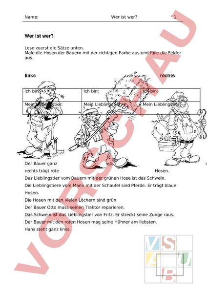 Name: *1 Wer ist wer? Wer ist wer? Lese zuerst die Sätze unten. Male die Hosen der Bauern mit der richtigen Farbe aus und fülle die Felder aus. links rechts Ich bin: Ich bin: Ich bin: Mein Lieblingstier: Mein Lieblingstier: Mein Lieblingstier: Der Bauer ganz rechts trägt rote Hosen. Das Lieblingstier vom Bauern mit der grünen Hose ist das Schwein. Die Lieblingstiere vom Mann mit der Schaufel sind Pferde. Er trägt blaue Hosen. Die Hosen mit den vielen Löchern sind grün. Der Bauer Otto muss seinen Traktor reparieren. Das Schwein ist das Lieblingstier von Fritz. Er streckt seine Zunge raus. Der Bauer mit den roten Hosen mag seine Hühner am liebsten. Hans steht ganz links.