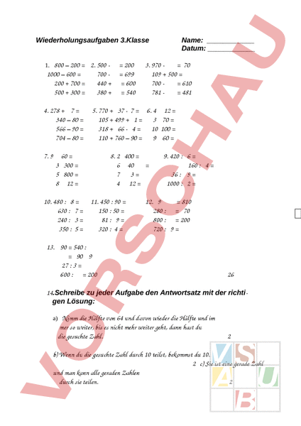 Wiederholungsaufgaben 3.Klasse 1. 800 – 200 2. 500 1000 – 600 200 700 500 300 4. 278 7 340 – 80 566 – 90 704 – 80 7. 9 700 440 380 3. 970 70 109 500 700 610 781 481 5. 770 37 7 6. 4 12 105 499 1 3 70 318 66 4 10 100 110 760 – 90 9 60 60 3 300 5 800 8 12 10. 480 8 630 7 240 3 350 5 200 699 600 540 Name: Datum: 8. 2 400 6 40 7 3 4 12 11. 450 90 150 50 81 9 320 4 9. 420 6 160 4 36 9 1000 2 12. 9 810 280 70 800 200 720 9 13. 90 540 90 9 27 3 600 200 26 14.Schreibe zu jeder Aufgabe den Antwortsatz mit der richti gen Lösung: a) Nimm die Hälfte von 64 und davon wieder die Hälfte und im mer so weiter, bis es nicht mehr weiter geht, dann hast du die gesuchte Zahl. 2 b) Wenn du die gesuchte Zahl durch 10 teilst, bekommst du 10. 2 c) Sie ist eine gerade Zahl und man kann alle geraden Zahlen durch sie teilen. 2 d) Die gesuchte Zahl ist um die kleinste zweistellige Zahl klei ner als 1000. Punkte: 34 Note: 2