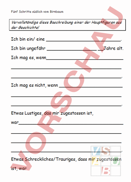 Fünf Schritte südlich vom Birnbaum Vervollständige diese Beschreibung einer der Hauptfiguren aus der Geschichte! Ich bin ein/ eine. Ich bin ungefähr Jahre alt. Ich mag es, wenn . Ich mag es nicht, wenn . Etwas Lustiges, das mir zugestossen ist, war . Etwas Schreckliches/Trauriges, dass mir zugestossen ist, war Charakterrätsel . WeitereTipps: Gib nun die vollständige Beschreibung einem Freund/Freundin. Kann er oder sie herausbekommen um wenn es sich handelt? Wenn dein Partner die Figur erraten hat, soll er ein Bild von der Figur zeichen!