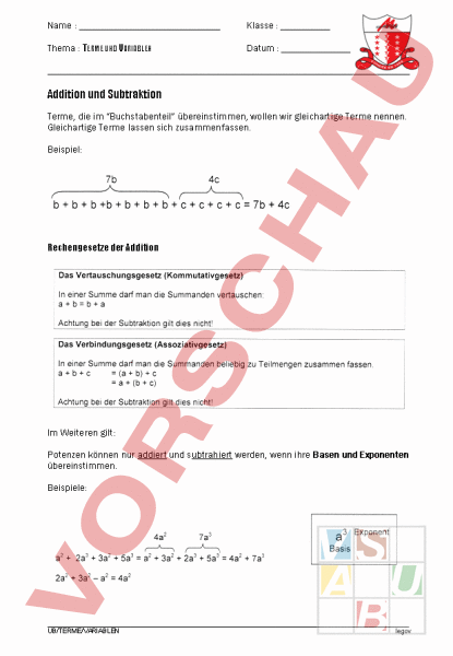 Name Klasse Thema TERME UND VARIABLEN Datum Addition und Subtraktion Terme, die im Buchstabenteil übereinstimmen, wollen wir gleichartige Terme nennen. Gleichartige Terme lassen sich zusammenfassen. Beispiel: Rechengesetze der Addition Im Weiteren gilt: Potenzen können nur addiert und subtrahiert werden, wenn ihre Basen und Exponenten übereinstimmen. Beispiele: ÜB/TERME/VARIABLEN legov Übung 1: 1. 4ab32ab3ab5ab3 2. 4a35ab—2a3—4ab 3. 25a2b3 12a2b2 — 7a2b3 4. 56ab78a245a2b12ab—15a2 5. a2b3 4a3b3 12a3b3 2a3b3 4a2b3 5a3b2 Multiplikation und Division Rechengesetze der Multiplikation Potenzen mit gleicher Basis werden multipliziert, indem ihre Exponenten addiert werden. a2 a3 a5 Potenzen mit gleicher Basis werden dividiert, indem ihre Exponenten subtrahiert werden. a5: a2 a3 Eine Summe mit gleichen Summanden fassen wir zu einem Produkt zusammen: 5a Ein Produkt ist also die Kurzschreibweise für eine Summe mit gleichen Summanden. ÜB/TERME/VARIABLEN legov Zwei Summen werden miteinander multipliziert, indem jedes Glied der einen Summe mit jedem Glied der anderen multipliziert wird. Die Teilprodukte werden addiert. Übung 2: 1. x5 7x3y2 2; (2x)2 7x3y2 3. t43t242t(t3t) 4. a2b(3a3b 5b2) 3ab2(2a4 ab) 5. (6s11 66s8 126s5) 6s3 6. 2x 3y5ab3x y8 2ab 7. 7x (2y3z4) Und errinerst du dich an diese KIammerregel? 8. 15(5a 3b) [2(3a b)] 9. 523y12(79x 32y128) 10. 5r7s(3r14t) (2s r) (4r7t) 11. 4ef5 6e8f2 3f4 12. 4r3s4(r3 5s) 13. 8t(6s3 — 4t4) 14. 5x5z4(3x3z4—6xz) 15. 14(1Oz 6)— 5(2z 7) 16. 10(12a7b)—5(3a—2b) ÜB/TERME/VARIABLEN legov 17. 9(1Om6n)—[4(3rn11n)] ÜB/TERME/VARIABLEN legov