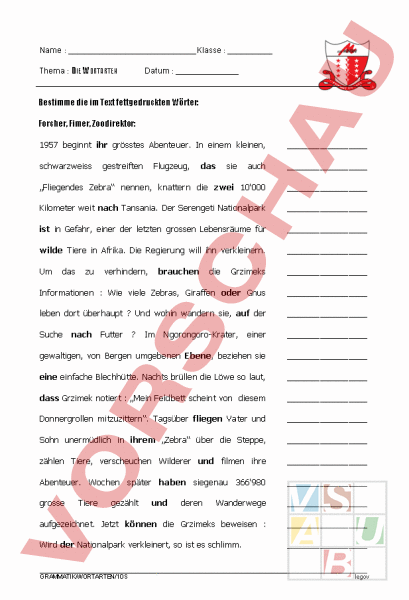 Name Klasse Thema DIE WORTARTEN Datum Bestimme die im Text fettgedruckten Wörter: Forcher, Fimer, Zoodirektor: 1957 beginnt ihr grösstes Abenteuer. In einem kleinen, schwarzweiss auch „Fliegendes Zebra nennen, knattern die zwei 10‘000 Kilometer weit nach Tansania. Der Serengeti Nationalpark ist in Gefahr, einer der letzten grossen Lebensräume für wilde Tiere in Afrika. Die Regierung will ihn verkleinern. Um Grzimeks Informationen Wie viele Zebras, Giraffen oder Gnus leben dort überhaupt Und wohin wandern sie, auf der Suche nach Futter Im Ngorongoro-Krater, einer gewaltigen, von Bergen umgebenen Ebene, beziehen sie eine einfache Blechhütte. Nachts brüllen die Löwe so laut, dass Grzimek notiert „Mein Feldbett scheint von diesem Donnergrollen mitzuzittern. Tagsüber fliegen Vater und Sohn unermüdlich in ihrem „Zebra über die Steppe, zählen Tiere, verscheuchen Wilderer und filmen ihre Abenteuer. Wochen später haben siegenau 366‘980 grosse Wanderwege aufgezeichnet. Jetzt können die Grzimeks beweisen Wird der Nationalpark verkleinert, so ist es schlimm. das zu Tiere gestreiften verhindern, gezählt Flugzeug, das brauchen und deren die sie GRAMMATIK/WORTARTEN/1OS legov