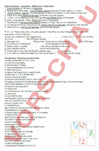 discrimination prejudice difference distinction 1. Discrimination is the result of prejudice. 2. People have often been discriminated against because of race, religion, or colour. 3. Discrimination against coloured people is serious problem in many parts of the world. 4. There is no real difference between white and coloured people. 5. In fact, it is misleading to say that negroes are different from white people. 6. Many white people, in fact, differ from other white people. 7. People tend to be prejudiced against people or things they do not understand. 8. In the eyes of the law one should not make distinction between one person and another. 9. We should only distinguish between good and bad people. Fill in: a) There were many coloured people in the office, but the manager shook hands with everybody without making . b) Can you understand why negroes are . . in the U.S.A.? c) Our way of life is not much . that of English people. d) Germans only Englishmen in that the two nations live in parts of Europe. e) It is difficult to make exact . all the peoples of the world. f) There is really no great . the various peoples of the world. g) Many people cannot . opinion and prejudice. h) There was time when the English people were . . the Scots. j) In our Century there have been too many examples of . nations and races. Vocabulary: American government to elect president for four yours to vote for candidate to be the Head of State to have representative functions to lead the country to determine foreign policy (bestimmen) to take part in s.th. (teilnehmen) the law-making process to be the most powerful man in the world Congress consists of the Senate and the House of Representatives (mind the articles!) the number depends on the number of people in to have small population to make laws tio introduce bill /law (bill bevor verabschiedet) to veto law to override the veto the President checks on Congress and vice versa law is unconstitutional lower/ higher court to interpret laws each branch of the government has its own rights the separation of powers to face majority of the other party in Congress to leave office each branch watches over what the others do system of checks and balances power is balanced state government some areas are not touched by federal laws to decide for itself school leaving age/ driving age to regulate s.th. by law to have great influence/ power to play an important role in the world the commander of the troops to become President to be elected President of the U.S.