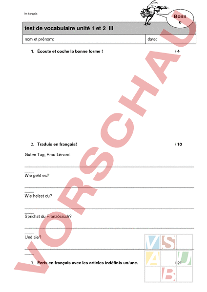 le français Bonn test de vocabulaire unité 1 et 2 III nom et prénom: date: 1. Écoute et coche la bonne forme /4 2. Traduis en français! 10 Guten Tag, Frau Lénard. Wie geht es? Wie heisst du? Sprichst du Französisch? Und sie? 3. Écris en français avec les articles indéfinis un/une. 21 le français le français Selbsteinschätzung Punkte von 35 Punkten Ø Note