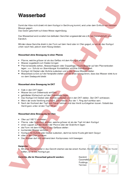 Wasserbad Damit die Hitze nicht direkt mit dem Kochgut in Berührung kommt, wird unter dem Einfluss von heissem Wasser gegart. Das Garen geschieht auf diese Weise regelmässig. Das Wasserbad wird vorallem bei delikaten Gerichten angewendet wie z.B. bei Caramelköpfli oder Eierstich. Würden diese Gerichte direkt in der Form auf dem Herd oder im Ofen gegart, so würde das Kochgut unten rasch fest, jedoch oben flüssig bleiben. Wasserbad ohne Bewegung in einer Pfanne • Pfanne, welche grösser ist als das Gefäss mit dem Kochgut wählen • Wasser zugedeckt zum Sieden bringen • Pfanne beiseite ziehen, Abwaschlappen oder Doppellage Haushaltpapier auf den Pfannenboden legen Schutz vor übermässiger Kontakthitze; erhöhte Standfestigkeit. • Kochgut mit Deckel oder Alufolie zudecken und in das heisse Wasser stellen • Wasserbad zurück auf die Herdplatte stellen und die Hitze so regulieren, dass das Wasser stets kurz vor dem Siedepunkt bleibt Wasserbad ohne Bewegung im DKT • • • • • • Sieb in den DKT legen Wasser bis zum Siebeinsatz einfüllen gefalltetes Küchentuch auf den Siebeinsatz legen Das Kochgut mit Deckel oder Alufolie zudecken und in den DKT stellen. Den DKT schliessen. Wenn der erste Ventilring erscheint, Zeit messen. Nur der 1. Ring darf sichtbar sein. Nach der Kochzeit den Topf vom Feuer nehmen und das Ventil zurückgehen lassen. Sobald das Ventil ganz unten ist den Topf öffnen. Wasserbad ohne Bewegung im Ofen • • • • • • Ofen auf 160C vorheizen Pfanne oder Gratinform wählen, welche grösser ist als der Topf mit dem Kochgut einen Lappen auf den Boden der Pfanne oder der Gratinform legen die Form mit dem Kochgut in das Gefässe stellen kochendes Wasser einfüllen Kochgut mit Alufolie oder Deckel zudecken, damit es keine Kruste gibt beim Gargut • alles in den Ofen schieben • Das Wasser darf sich während dem Kochprozess nicht bewegen Garprobe: • Mit einer Küchennadel in das Gericht stechen wie bei einem Kuchen. Bleibt nichts mehr an der Nadel haften, so ist das Kochgut gar. Gerichte, die im Wasserbad gekocht werden: Eierstich Caramelköpfli Puddings Terrinen Kochen auf dem Wasserbad • Grosser Schwingbesen verwenden, damit schnell viel Luft unter die Masse gerührt werden kann. • Grosse Schüssel wählen. Dadurch wird die Masse schneller schaumig. Die Schüssel muss grösser als die Pfanne sein. Schüssel darf das Wasser nicht berrühren!!! • Dampf erwärmt gleichmässiger als Wasser. • Ca. 3 cm Wasser in die Pfanne füllen. Wassertemperatur muss unter dem Siedepunkt bleiben, höchsten 80C. Anwendung Schaumigrühren z.B. von Eiern in der Wärme Masse wird luftiger von Eiern und Zucker Zucker löst sich besser auf Eigelb für Sauce hollandaise Eigelb und Zucker für Crème (z.B. Sabayon) Schmelzen von Schokolade Die Schokolade mit dem Messer zerhacken. Sie löst sich gleichmässiger auf. Auflösen von Gelatine Merke: Das Wasser darf auf keinen Fall kochen!!! Nur ziehen!!! Sonst gerinnen die Eier. Die Schokolade bekommt Knollen (Kakaobutter scheidet aus und Zucker caramelisiert) Die Gelatine wird leimig und erhält einen unangenehmen Geschmack.