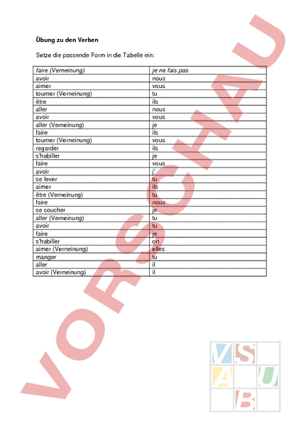 Übung zu den Verben Setze die passende Form in die Tabelle ein: faire (Verneinung) avoir aimer tourner (Verneinung) être aller avoir aller (Verneinung) faire tourner (Verneinung) regarder shabiller faire avoir se lever aimer être (Verneinung) faire se coucher aller (Verneinung) avoir faire shabiller aimer (Verneinung) manger aller avoir (Verneinung) je ne fais pas nous vous tu ils nous vous je ils vous ils je vous tu ils tu nous je tu tu je on elles tu il il Übung zu den Verben Setze die passende Form in die Tabelle ein: faire (Verneinung) avoir aimer tourner (Verneinung) être aller avoir aller (Verneinung) faire tourner (Verneinung) regarder shabiller faire avoir se lever aimer être (Verneinung) faire se coucher aller (Verneinung) avoir faire shabiller aimer (Verneinung) manger aller avoir (Verneinung) je ne fais pas nous avons vous aimez tu ne tournes pas ils sont nous allons vous avez je ne vais pas ils font vous ne tournez pas ils regardent je mhabille vous faites jai tu te lèves ils aiment tu nes pas nous faisons je me couche tu ne vas pas tu as je fais on shabille elles naiment pas tu manges il va il na pas