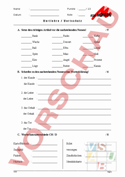 Name Punkte 23 Datum Note Wortlehre Wortschatz A. Setze den richtigen Artikel vor die nachstehenden Nomen! Bank Radio Käfig Wachs Dessert Spital Ball Efeu Lineal Spitz Mais Null Kies Angel Prozent Lüge Butter Kamin B. Schreibe zu den nachstehenden Nomen eine Worterklärung! /9 /6 1. der Kunde die Kunde 2. die Leiter der Leiter 3. das Gehalt der Gehalt 3. das Tor der Tor C. Wortschatzunterschiede CH D /8 Kartoffelstock Billet Sackgeld versorgen Finken Zündhölzchen Nastuch Identitätskarte 1OS legov