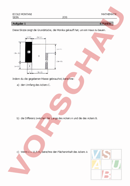 ECOLE MONTANI SION MATHEMATIK 2OS Aufgabe 1 6 Punkte Diese Skizze zeigt die Grundstücke, die Monika gekauft hat, um ein Haus zu bauen. Indem du die gegebenen Masse gebrauchst, berechne: a) den Umfang des Ackers C. b) die Differenz zwischen der Länge des Ackers und die des Ackers B. c) Wenn 11,5 m, berechne den Flächeninhalt des Ackers ECOLE MONTANI SION MATHEMATIK 2OS Aufgabe 2 3 Punkte Ein Behälter wird an den 2/5 gefüllt. Wenn man 525 Liter hinzufügt, wird er an den 3/4 gefüllt. Berechne die Kapazität des Behälters in Litern. Aufgabe 3 Berechne, fasse die Terme zusammen oder kürze: (3x 5)(4 2 6 13) 2 2 3x 3 3 4 21x 2 7 3 6 3 6a 1 3a 2a 6 3 2 4 5 Punkte ECOLE MONTANI SION Aufgabe 4 Bestimme die Lösungsmenge: 2 [3x 2 (3x 2 )] 4 (4 1) 2x 7 4x 3 5 5 3 15 3 (2 1) 16 (x 1) 2 (x 1) 3x 1 2x 5 1 2 3 2OS MATHEMATIK 10 Punkte ECOLE MONTANI SION 2OS Aufgabe 5 MATHEMATIK 10 Punkte Löse die Klammern auf und fasse zusammen: 14 [2 (4 3y (12 23y 5 ] ) 5a4 4 2b2 3 (pq) 4 3 (2a 7b )2 5 2 4 3 1 4 (x 2 Berechne den Term für: 3, 4, 7 3a2 3b 2c 4 (3c 2a Aufgabe 6 2 Punkte Berechne mit dem Taschenrechner und runde das Resultat auf 3 Stellen nach dem Komma: 3 2 1 2,4 5 1) 1,645 2 3 (56,1 34,7 (17,1 5,2) 17 2 9,468 ECOLE MONTANI SION Aufgabe 7 2OS MATHEMATIK 2 Punkte Von einer 2. Orientierungsklasse haben 76% der Schüler einen Sommerjob. 6 Schüler haben noch keine Beschäftigung. Wie gross ist die Klasse? Aufgabe 8 2 Punkte Im letzten Winter konnte ein Haus mit 8,19 Kohle 78 Tage lang geheizt werden. Wie viel Kohle braucht man, wenn während 117 Tagen geheizt werden muss? Wie lange kann man mit 0,6 Kohle heizen. Wir nehmen an, es werde jeden Tag gleich viel Kohle verbrannt. Aufgabe 9 2 Punkte Auf einer Wanderkarte 1 50 000 des Kantons Uri hat der Reusskanal zwischen AttingHauserbrücke und Reussdelta eine Länge von 8,1 cm. Wie gross ist die Länge in Wirklichkeit? ECOLE MONTANI SION 2OS Aufgabe 10 MATHEMATIK 12 Punkte Kürze, wenn es möglich ist, und berechne: 2a 24b 5 4b 3 8a 3a 3 16 4 5a 12 3xy 2 7z 14 6 3a2 12b2 3x 5a 15a2 ( 3xy 4a 5 xz 15 xy 10 5 30 2 2 6a2b2 2y ECOLE MONTANI SION Aufgabe 11 MATHEMATIK 2OS 12 Punkte In einem Hochhaus wohnen 60 Personen. Davon sind 5 Walliser, 12 Basler und 25 Zürcher. Der Rest sind Berner. a) Wie viele Prozent sind Berner? b) Zeichne dazu ein Kreisdiagramm und gib die Grössen der einzelnen Zentriwinkel an.