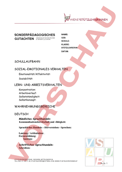 SONDERPÄDAGOGISCHES GUTACHTEN GEMÄß ERLASS DES SSR FÜR WIEN Zl. 100.035/93 vom 22.09.1993 NAME: GEB: SCHULE: KLASSE: STÜTZLEHRER/IN: DATUM: SCHULLAUFBAHN SOZIAL-EMOTIONALES VERHALTEN Emotionalität/Affektivität: Soziabilität: LERN- UND ARBEITSVERHALTEN Konzentration: Arbeitsverlauf: Selbstständigkeit: Selbstkonzept: WAHRNEHMUNGSBEREICHE DEUTSCH Mündliches Sprachhandeln: Kommunikationsbereitschaft und -fähigkeit: Sprachliches Handeln – Hörverstehen Sprechen: Lautung Artikulation: Formenbildung: Satzbau: Schriftliches Sprachhandeln: Schreiben: STÜTZLEHRERZENTRUM, 1060 WIEN, MITTELGASSE 24 TEL./FAX: 01- 503 71 48, WWW.STUETZLEHRERINNEN.AT Seite 1 Rechtschreiben: Umgang mit Texten: MATHEMATISCHER BEREICH Zahlenraum 100: Zahlenraum 1000: ZUSAMMENFASSUNG Wien, 6.April 2009 SObln. Vorname Zuname STÜTZLEHRERZENTRUM, 1060 WIEN, MITTELGASSE 24 TEL./FAX: 01- 503 71 48, WWW.STUETZLEHRERINNEN.AT Seite 2