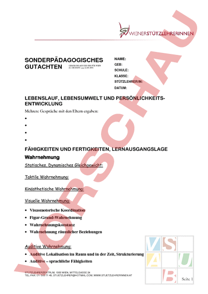 SONDERPÄDAGOGISCHES GUTACHTEN GEMÄß ERLASS DES SSR FÜR WIEN Zl. 100.035/93 vom 22.09.1993 NAME: GEB: SCHULE: KLASSE: STÜTZLEHRER/IN: DATUM: LEBENSLAUF, LEBENSUMWELT UND PERSÖNLICHKEITSENTWICKLUNG Mehrere Gespräche mit den Eltern ergaben: • • • • FÄHIGKEITEN UND FERTIGKEITEN, LERNAUSGANGSLAGE Wahrnehmung Statisches, Dynamisches Gleichgewicht: Taktile Wahrnehmung: Kinästhetische Wahrnehmung: Visuelle Wahrnehmung: • Visuomotorische Koordination • Figur-Grund-Wahrnehmung • Wahrnehmungskonstanz • Wahrnehmung räumlicher Beziehungen Auditive Wahrnehmung: • Auditive Lokalisation im Raum und in der Zeit, Strukturierung • Auditive – sprachliche Fähigkeiten STÜTZLEHRERZENTRUM, 1060 WIEN, MITTELGASSE 24 TEL./FAX: 01- 503 71 48, WWW.STUETZLEHRERINNEN.AT Seite 1 Sensu Sensuomotorik – Gesamtkörper Koordination Körperschema: Praxie: Lateralität: Sozial emotionales Verhalten Verhalten LernLern- und Arbeitsverhalten Lernbereitschaft: Arbeitshaltung: Selbstständigkeit: Kognitive Fähigkeiten Orientierung: Gedächtnis: Schlussfolgerndes und problemlösendes Denken: Sprache und Kommunikation Phonetisch – phonologischer Bereich: Morphologisch – syntaktischer Bereich: Semantisch lexikalischer Bereich: Schulische Lernbereiche Lesen: Schreib- und Rechtschreibfähigkeiten: Rechnen: Grundlagen, Zahlen, Operationsverständnis: Zahlenraum bis 10: Zahlenraum bis 20: STÜTZLEHRERZENTRUM, 1060 WIEN, MITTELGASSE 24 TEL./FAX: 01- 503 71 48, WWW.STUETZLEHRERINNEN.AT Seite 2 SCHLUSSFOLGERUNGEN Wien, 02.Juni 2009 Dipl.Pädn. Vorname Zuname STÜTZLEHRERZENTRUM, 1060 WIEN, MITTELGASSE 24 TEL./FAX: 01- 503 71 48, WWW.STUETZLEHRERINNEN.AT Seite 3