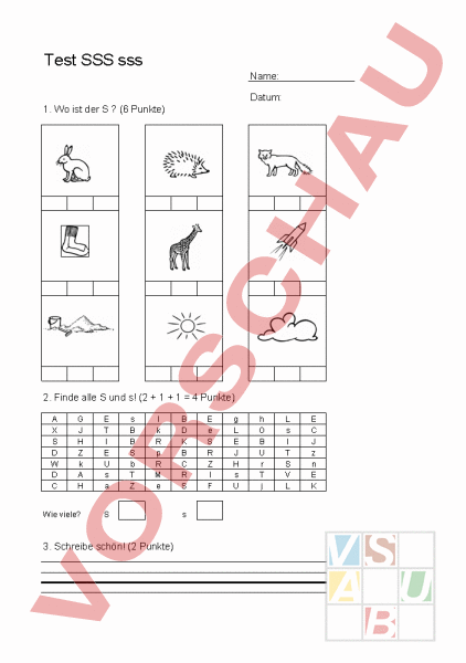 Test SSS sss Name: Datum: 1. Wo ist der ? (6 Punkte) 2. Finde alle und s! (2 1 1 4 Punkte) X D D J Z A Wie viele? T E s B S T k p M 3. Schreibe schön! (2 Punkte) D B R e R I L J s O U T s T V C z E 4. Wo hörst du den ? (6 Punkte) 5. Schreibe ein Wort mit einem S. (2 Punkte) Punkte So habe ich gearbeitet: Diese Lernzeile hast du erreicht: Du kannst die Position des in einem Wort anzeigen. Du kannst den in einem Wort heraushören und seine Position angeben. Du erkennst den / in einem Wort und kannst ihn anmalen. Du kannst den / korrekt schreiben. Du eine ganzes Wort mit / korrekt schreiben. Rückmeldung der Lehrperson: Datum: Unterschrift der Eltern: Rückmeldung der Eltern: