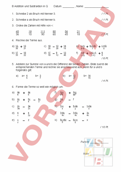 B Addition und Subtraktion in Datum: Name: 1. Schreibe 2 als Bruch mit Nenner 3. 1 Pt. 2. Schreibe als Bruch mit Nenner b. 1 Pt. 3. Ordne die Zahlen mit Hilfe von
