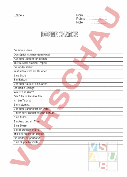 Etape 7 Da ist ein Haus. Das Spital ist hinter dem Hotel. Auf dem Dach ist ein Kamin. Im Haus hat es eine Treppe. Da ist der Keller. Im Garten steht ein Brunnen. Eine Store Ein Balkon Vor dem Haus ist ein Garten. Da ist die Garage. Wo ist das Kino? Der Film ist im Kino Rex. Ich bin Tourist. Ein Motorrad. Vor dem Bahnhof ist ein Park. Hinter der Post hat es eine Schule. Eine Tulpe Ein Auto und ein Tram Eine Bluse Sie ist auf dem Markt. Im Park hat es ein Bassin. Da ist der Supermarkt. Eine Suppe für mich. Nom:. Points:. Note :.