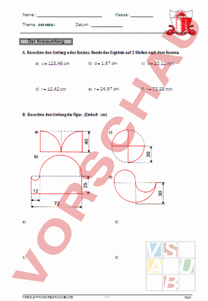 Name Thema DER KREIS Klasse Datum Der Kreisumfang A. Berechne den Umfang des Kreises. Runde das Ergebnis auf 2 Stellen nach dem Komma. a) 123,46 cm b) 1,67 dm c) 20,12 mm d) 12,42 cm e) 24,97 dm f) 73,26 mm B. Berechne den Umfang der Figur. (Einheit cm) a) b) c) d) KREISUMFANG/KREISFLÄCHE/2OS -1legov Die Kreisfläche A. Berechne die Kreisfläche A. Runde das Ergebnis auf 2 Stellen nach dem Komma. a) 12,32 cm b) 34,77 dm c) 2,92 d) 6,28 cm e) 1,92 dm f) 18,46 B. Berechne den Inhalt der markierten Fläche. (Einheit cm) a) b) c) d) KREISUMFANG/KREISFLÄCHE/2OS -2legov