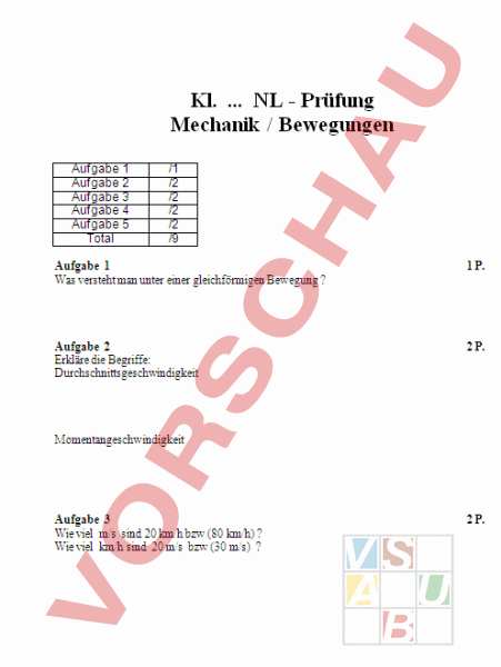 Kl. . NL Prüfung Mechanik Bewegungen Aufgabe 1 Aufgabe 2 Aufgabe 3 Aufgabe 4 Aufgabe 5 Total /1 /2 /2 /2 /2 /9 Aufgabe 1 Was versteht man unter einer gleichförmigen Bewegung 1 P. Aufgabe 2 Erkläre die Begriffe: Durchschnittsgeschwindigkeit 2 P. Momentangeschwindigkeit Aufgabe 3 Wie viel m/s sind 20 km/h bzw (80 km/h) Wie viel km/h sind 20 m/s bzw (30 m/s) 2 P. Aufgabe 4 Ein Auto fährt mit der Geschwindigkeit 120 km/h. Wie weit kommt es in 10 ? 2 P. Aufgabe 5 2 P. Achtung Unfallgefahr Jeder Verkehrsteilnehmer darf nur so schnell fahren, dass er immer rechtzeitig anhalten kann. Der notwendige Anhalteweg wird häufig unterschätzt. Ein Auto fährt z.B mit 50 km /h in der Stadt. Es legt in jeder Sekunde 14 zurück. Da rollt plötzlich ein Ball etwa 6 parkende Autos voraus auf die Fahrbahn; die Entfernung beträgt also etwa 40m. Kann der Fahrer noch rechtzeitig halten Die Reaktionszeit des Fahrers liegt zwischen 0.3 und 1.7 s. Wir wählen 1 ; in dieser Zeit fährt das Auto ungebremst weiter! Das sind hier 14 m. Nun wird gebremst. In der Fahrschule lernt man: Geschwindigkeit in km/h durch 10, davon das Quadrat, das ist der Bremsweg in Metern. Bei 50 km/h beträgt er 25m. Für den Anhalteweg ergibt sich: 14 25 39 Reaktionsweg Bremsweg Anhalteweg Es reicht gerade eben Aufgabe Bestimme den Anhalteweg für ein Auto, das mit der Geschwindigkeit von 130 km/h fährt NL – Prüfung Lösung Mechanik Bewegungen Aufgabe 1 Aufgabe 2 Aufgabe 3 Aufgabe 4 Aufgabe 5 Total /1 /2 /2 /2 /2 /9 Aufgabe 1 Was versteht man unter einer gleichförmigen Bewegung 1 P. Gleich lange Wege werden in gleichen Zeiten zurückgelegt Aufgabe 2 Erkläre die Begriffe: Durchschnittsgeschwindigkeit 2 P. Bei einer beschleunigten Bewegung heisst der Quotient aus zurückgelegtem Weg und der benötigten Zeit Durchschnittsgeschwindigkeit. Momentangeschwindigkeit Geschwindigkeit zu einem gewissen Zeitpunkt Aufgabe 3 Wie viel km/h sind 20 m/s bzw (30 m/s) Wie viel m/s sind 20 km/h bzw (80 km/h) 2 P. 72 km/h 5.6 m/s 108 km/h ( 22,44 m/s Aufgabe 4 Ein Auto fährt mit der Geschwindigkeit 120 km/h. Wie weit kommt es in 10 ? 120 km/h 120 0.28 m/s 33.6 m/s 2 P. 336 Aufgabe 5 2 P. Achtung Unfallgefahr Jeder Verkehrsteilnehmer darf nur so schnell fahren, dass er immer rechtzeitig anhalten kann. Der notwendige Anhalteweg wird häufig unterschätzt. Ein Auto fährt z.B mit 50 km /h in der Stadt. Es legt in jeder Sekunde 14 zurück. Da rollt plötzlich ein Ball etwa 6 parkende Autos voraus auf die Fahrbahn; die Entfernung beträgt also etwa 40m. Kann der Fahrer noch rechtzeitig halten Die Reaktionszeit des Fahrers liegt zwischen 0.3 und 1.7 s. Wir wählen 1 ; in dieser Zeit fährt das Auto ungebremst weiter! Das sind hier 14 m. Nun wird gebremst. In der Fahrschule lernt man: Geschwindigkeit in km/h durch 10, davon das Quadrat, das ist der Bremsweg in Metern. Bei 50 km/h beträgt er 25m. Für den Anhalteweg ergibt sich: 14 25 39 Reaktionsweg Bremsweg Anhalteweg Es reicht gerade eben Aufgabe Bestimme den Anhalteweg für ein Auto, das mit der Geschwindigkeit von 130 km/h fährt Reaktionsweg Bremsweg Anhalteweg 130 0.28 m/s 1 132 36.4 169 205.4 205 2m