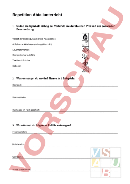 Arbeitsblatt mit Fragen zur Repetition der Themen Abfall und Entsorgung. Inklusive Lösungen.