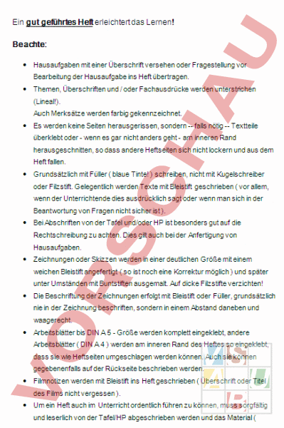 Ein gut geführtes Heft erleichtert das Lernen! Beachte: • Hausaufgaben mit einer Überschrift versehen oder Fragestellung vor Bearbeitung der Hausaufgabe ins Heft übertragen. • Themen, Überschriften und oder Fachausdrücke werden unterstrichen (Lineal!). Auch Merksätze werden farbig gekennzeichnet. • Es werden keine Seiten herausgerissen, sondern -- falls nötig -- Textteile überklebt oder wenn es gar nicht anders geht am inneren Rand herausgeschnitten, so dass andere Heftseiten sich nicht lockern und aus dem Heft fallen. • Grundsätzlich mit Füller blaue Tinte! schreiben, nicht mit Kugelschreiber oder Filzstift. Gelegentlich werden Texte mit Bleistift geschrieben vor allem, wenn der Unterrichtende dies ausdrücklich sagt oder wenn man sich in der Beantwortung von Fragen nicht sicher ist ). • Bei Abschriften von der Tafel und/oder HP ist besonders gut auf die Rechtschreibung zu achten. Dies gilt auch bei der Anfertigung von Hausaufgaben. • Zeichnungen oder Skizzen werden in einer deutlichen Größe mit einem weichen Bleistift angefertigt so ist noch eine Korrektur möglich und später unter Umständen mit Buntstiften ausgemalt. Auf dicke Filzstifte verzichten! • Die Beschriftung der Zeichnungen erfolgt mit Bleistift oder Füller, grundsätzlich nie in der Zeichnung beschriften, sondern in einem Abstand daneben und waagerecht. • Arbeitsblätter bis DIN 5 Größe werden komplett eingeklebt, andere Arbeitsblätter DIN 4 werden am inneren Rand des Heftes so eingeklebt, dass sie wie Heftseiten umgeschlagen werden können. Auch sie können gegebenenfalls auf der Rückseite beschrieben werden. • Filmnotizen werden mit Bleistift ins Heft geschrieben Überschrift oder Titel des Films nicht vergessen ). • Um ein Heft auch im Unterricht ordentlich führen zu können, muss sorgfältig und leserlich von der Tafel/HP abgeschrieben werden und das Material Füller, Bleistift, Radiergummi, Buntstifte, Lineal, Schere und Klebstoff muss zu jeder Stunde vorhanden sein. • Sammle regelmässig Zusatzmaterial wie Bilder, Texte, Quellen, die zum jeweiligen aktuellen Thema passen und gestalte fortlaufend dein Heft! • Wenn du in Unterrichtsstunden gefehlt hast, besorge dir zu den Stunden, in denen du gefehlt hast, die Arbeitsblätter, die bearbeitet wurden und trage die fehlenden Stunden nach. Solltest du dafür zu wenig Zeit haben, besorge dir eine Kopie der Unterrichtsmitschriften von einem Klassenkameraden, lies sie durch und klebe diese dann ein. • Sammle deine Hefte! Sie können später zum Wiederholen und Lückenschließen von Nutzen sein . eine richtige Überschrift geschrieben? . die Überschrift mit dem Lineal unterstrichen? . nach der Überschrift eine Reihe frei gelassen? . bündig geschrieben? . die Aufgaben nummeriert? Peter Steiner Klassenlehrer 1RC3 Oberstufe Cham/ZG