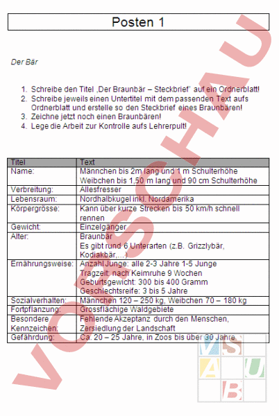 Posten 1 Der Bär 1. Schreibe den Titel ‚Der Braunbär – Steckbrief auf ein Ordnerblatt! 2. Schreibe jeweils einen Untertitel mit dem passenden Text aufs Ordnerblatt und erstelle so den Steckbrief eines Braunbären! 3. Zeichne jetzt noch einen Braunbären! 4. Lege die Arbeit zur Kontrolle aufs Lehrerpult! Titel Name: Text Männchen bis 2m lang und 1 Schulterhöhe Weibchen bis 1,50 lang und 90 cm Schulterhöhe Verbreitung: Allesfresser Lebensraum: Nordhalbkugel inkl. Nordamerika Körpergrösse: Kann über kurze Strecken bis 50 km/h schnell rennen Gewicht: Einzelgänger Alter: Braunbär Es gibt rund 6 Unterarten (z.B. Grizzlybär, Kodiakbär,) Ernährungsweise: Anzahl Junge: alle 2-3 Jahre 1-5 Junge Tragzeit: nach Keimruhe 9 Wochen Geburtsgewicht: 300 bis 400 Gramm Geschlechtsreife: 3 bis 5 Jahre Sozialverhalten: Männchen 120 – 250 kg, Weibchen 70 – 180 kg Fortpflanzung: Grossflächige Waldgebiete Besondere Fehlende Akzeptanz durch den Menschen, Kennzeichen: Zersiedlung der Landschaft Gefährdung: Ca. 20 – 25 Jahre, in Zoos bis über 30 Jahre